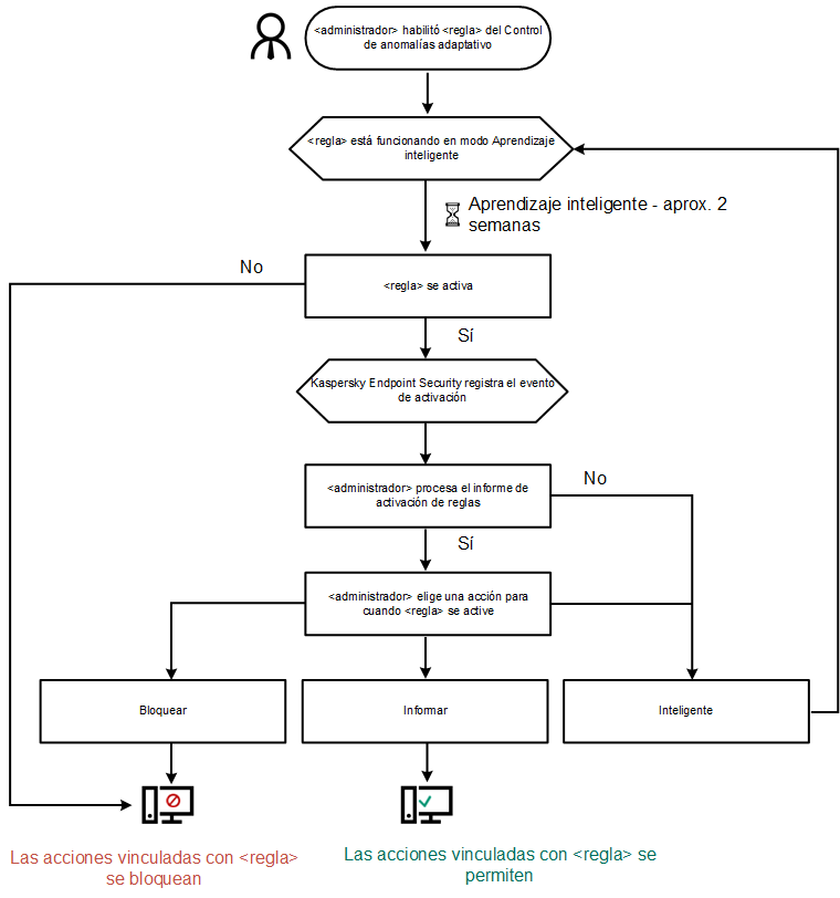 Una vez que el Control de anomalías adaptativo se habilita, sus reglas entran en un modo de aprendizaje. Mientras dicho modo está activo, el Control de anomalías adaptativo monitorea la activación de las reglas y envía los eventos de activación a Kaspersky Security Center. El tiempo de aprendizaje varía según la regla. Quienes definen la duración son los expertos de Kaspersky. Lo normal es que el modo de aprendizaje esté activo por dos semanas.
