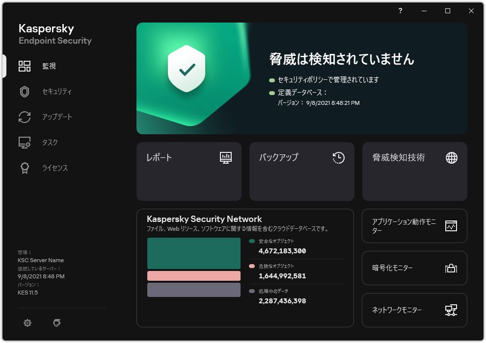 - Kaspersky Security Network.Kaspersky Endpoint Security と Kaspersky Security Network との接続ステータスとグローバル KSN 統計です。KSN(Kaspersky Security Network)はクラウドサービスの基盤であり、ファイル、Web リソース、ソフトウェアの評価に関する情報を含むカスペルスキーのオンラインナレッジベースへのアクセスを提供します。Kaspersky Security Network のデータを使用することにより、新しい脅威に対する Kaspersky Endpoint Security の対応が迅速化され、一部の保護機能の効果が高まり、誤検知の可能性が低減されます。Kaspersky Security Network に参加すると、KSN サービスから Kaspersky Endpoint Security にスキャンしたファイルのカテゴリと評価に関する情報およびスキャンした Web アドレスの評価に関する情報を取得できます。
