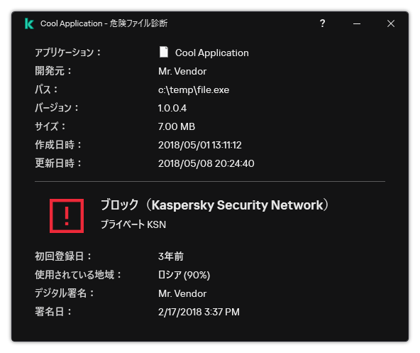 Kaspersky Endpoint Security は、ファイルに関する追加情報も表示します(下の図を参照)。