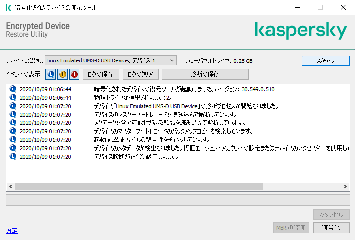 復元ツールによる暗号化デバイスへのアクセスの復元に必要なデータは、ユーザーのコンピューターのメモリに暗号化されていない形式で一定期間保存されます。そのようなデータに対する不正アクセスのリスクを減らすために、暗号化されたデバイスへのアクセスの復元は信頼できるコンピューター上で行ってください。