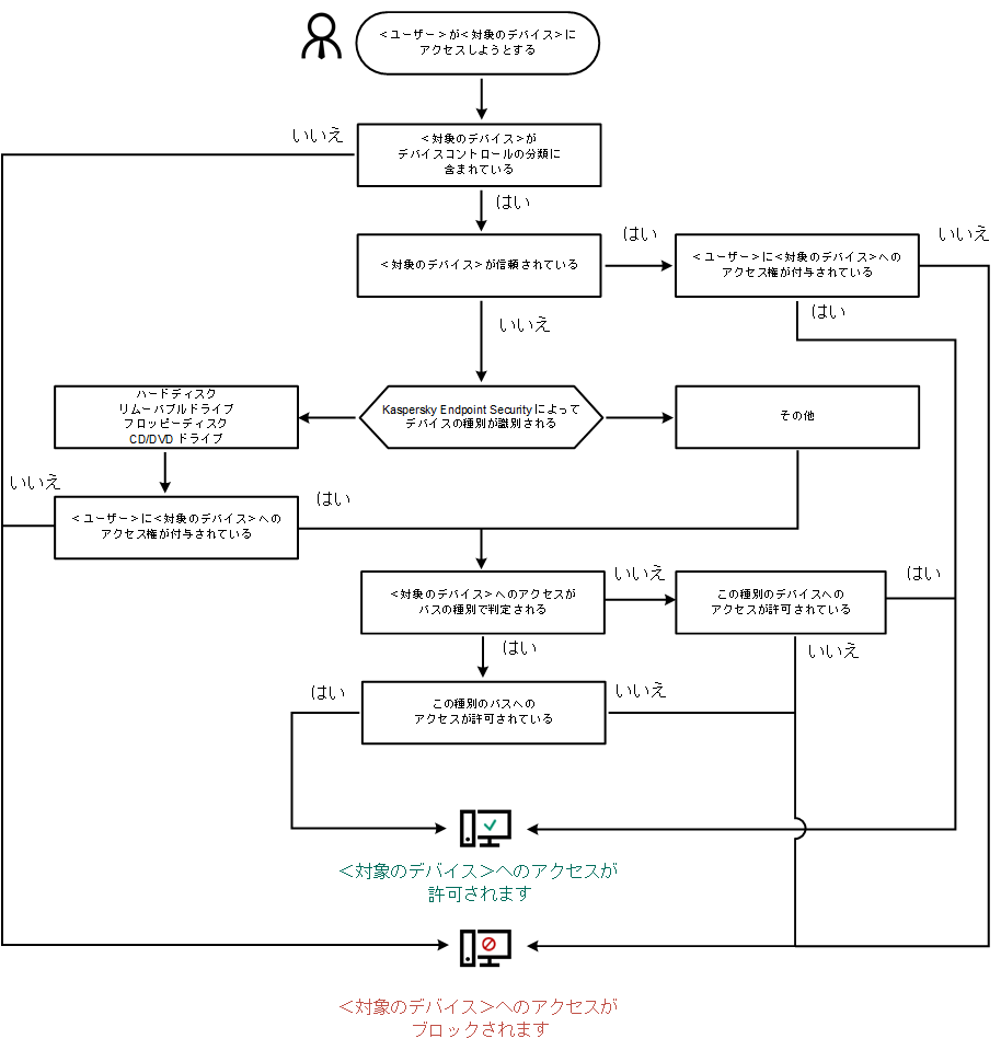 ユーザーがデバイスをコンピューターに接続すると、Kaspersky Endpoint Security はデバイスへのアクセスを許可するかどうかを決定します(以下の図を参照)。