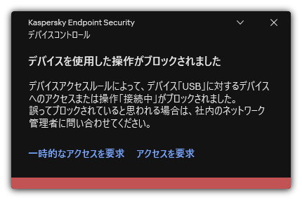 デバイスコントロールでブロックされているデバイスがコンピューターに接続された場合、Kaspersky Endpoint Security はアクセスをブロックし通知を表示します(以下の図を参照)。