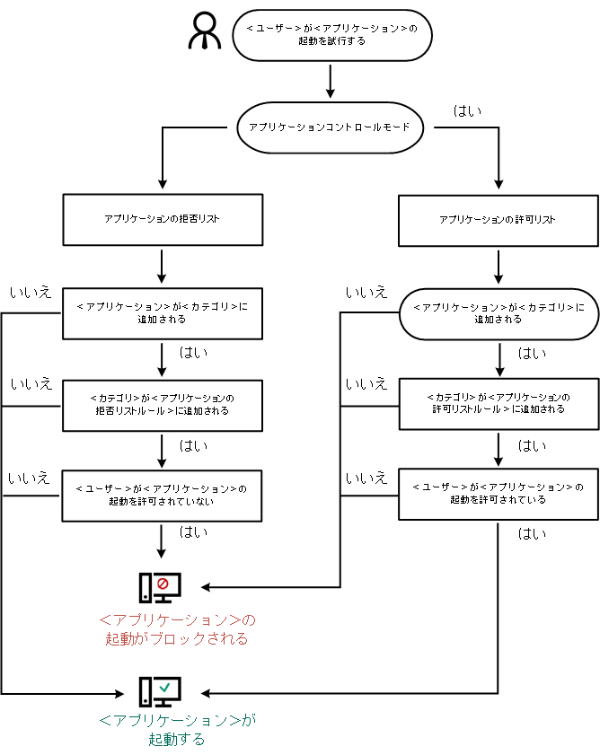 Kaspersky Endpoint Security は次の図のアルゴリズムに従って、ルールの適用対象となる動作の実行を許可するかブロックするかを判定します。