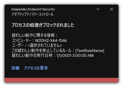 ブロックに関するメッセージ:典型的でない動作をブロックするアダプティブアノマリーコントロールルールが適用された際に表示されるメッセージのテンプレート。 管理者に送信するメッセージ:ブロックが誤検知だと考えられる場合に、社内のローカルネットワークの管理者に送信できるメッセージのテンプレート。ユーザーがアクセス権を要求した後、Kaspersky Endpoint Security は Kaspersky Security Center にイベントを送信します:アプリケーションの動作ブロックに関するメッセージが管理者に送信されました。このイベントの説明には、代用変数を含む管理者へのメッセージが含まれます。これらのイベントは、事前定義されたイベント抽出[ユーザー要求]を使用して Kaspersky Security Center コンソールで確認できます。組織で Kaspersky Security Center が導入されていない、または管理サーバーに接続されていない場合は、本製品は指定されたメールアドレスの管理者にメッセージを送信します。 |