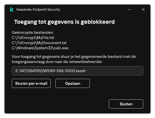 Na gegevensencryptie kan Kaspersky Endpoint Security de toegang tot gegevens beperken, bijvoorbeeld vanwege een wijziging in de infrastructuur van de organisatie en een wijziging in de Kaspersky Security Center Administration Server. Als een gebruiker geen toegang heeft tot geëncrypte gegevens, kan de gebruiker de beheerder om toegang tot de gegevens vragen. Met andere woorden, de gebruiker moet een bestand met een toegangsverzoek naar de beheerder sturen. De gebruiker moet vervolgens het antwoordbestand dat hij of zij van de beheerder heeft ontvangen, uploaden naar Kaspersky Endpoint Security. Met Kaspersky Endpoint Security kunt u via e-mail toegang tot gegevens aanvragen bij de beheerder (zie onderstaande afbeelding).