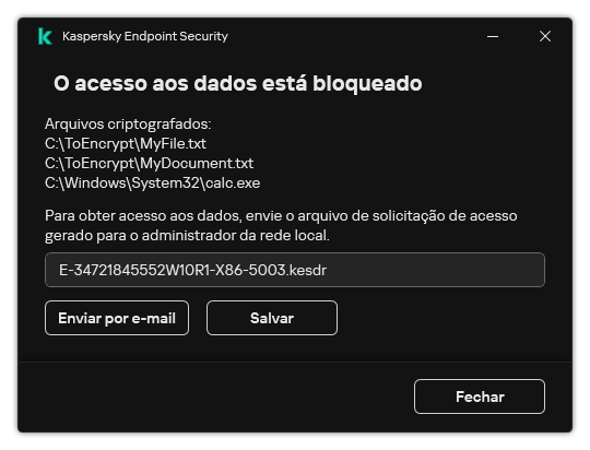 Para iniciar o procedimento de recuperação, o usuário precisa tentar acessar um arquivo. Como resultado, o Kaspersky Endpoint Security criará um arquivo de solicitação de acesso (um arquivo com a extensão KESDC), que o usuário precisará enviar ao administrador, por exemplo, por e-mail.