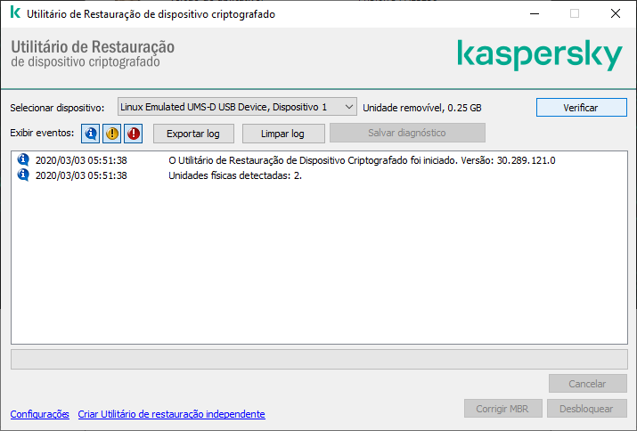 Se o computador tiver acesso à funcionalidade de criptografia do Kaspersky Endpoint Security, o Utilitário de restauração o avisa para desbloquear o dispositivo. Enquanto o desbloqueio do dispositivo não o descriptografar, o dispositivo se torna diretamente acessível como resultado do desbloqueio. Se o computador não tiver acesso à funcionalidade de criptografia do Kaspersky Endpoint Security, o Utilitário de restauração o avisa para descriptografar o dispositivo.