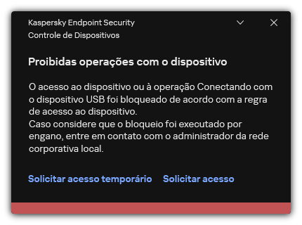 Quando um dispositivo que estiver bloqueado pelo Controle de Dispositivos for conectado ao computador, o Kaspersky Endpoint Security vai bloquear o acesso e exibir uma notificação (veja a figura abaixo).