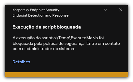 Consequentemente, o Kaspersky Endpoint Security bloqueia a execução de objetos: execução de arquivos executáveis e scripts, abertura de arquivos em formato office. Contudo, é possível, por exemplo, abrir um arquivo de script em um editor de texto, mesmo que a execução do script esteja impedida. Ao bloquear a execução de um objeto, o Kaspersky Endpoint Security exibe uma notificação padrão (veja a figura abaixo) caso as notificações estejam ativadas nas configurações do aplicativo.