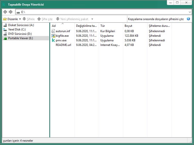 Çıkarılabilir sürücülerdeki şifreli dosyalara erişim için taşınabilir mod