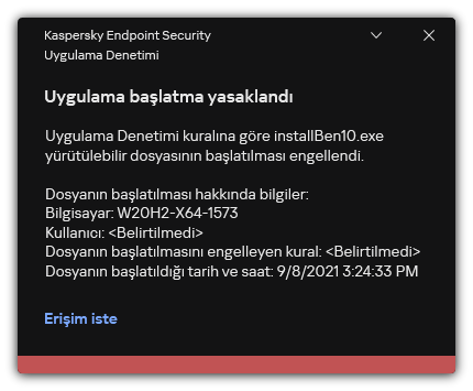 Kullanıcı, Uygulama Denetimi kuralı tarafından engellenen bir uygulamayı başlatmaya çalıştığında Kaspersky Endpoint Security, uygulamanın başlatılmasının engellendiğini belirten bir mesaj görüntüler. Kullanıcı, uygulamanın başlatılmasının yanlışlıkla engellendiğini düşünüyorsa mesaj metnindeki bağlantıyı kullanarak yerel kurumsal ağ yöneticisine bir mesaj gönderebilir.