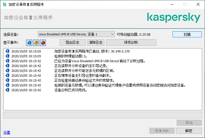 如果计算机可以访问 Kaspersky Endpoint Security 加密功能,“恢复实用工具”将提示您解锁设备。解锁设备并不进行解密,解锁的设备将可以直接访问。如果计算机不可以访问 Kaspersky Endpoint Security 加密功能,“恢复实用工具”将提示您解密设备。