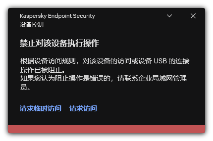 当被“设备控制”阻止的设备连接到计算机时,Kaspersky Endpoint Security 将阻止访问并显示通知(请参见下图)。