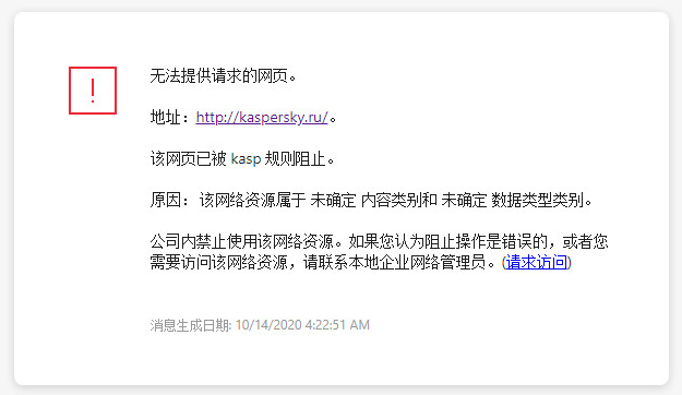 “Web 控制”管理用户对 Web 资源的访问。这有助于减少流量和工作时间的不当使用。当用户尝试打开受“Web 控制”限制的网站时,Kaspersky Endpoint Security 将阻止访问或显示警告(请参见下图)。