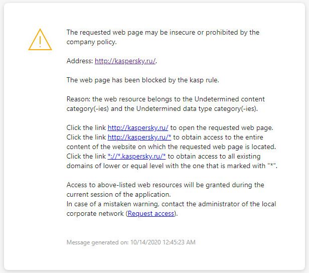 Web Control manages users' access to web resources. This helps reduce traffic and inappropriate use of work time. When a user tries to open a website that is restricted by Web Control, Kaspersky Endpoint Security will block access or show a warning (see the figure below).