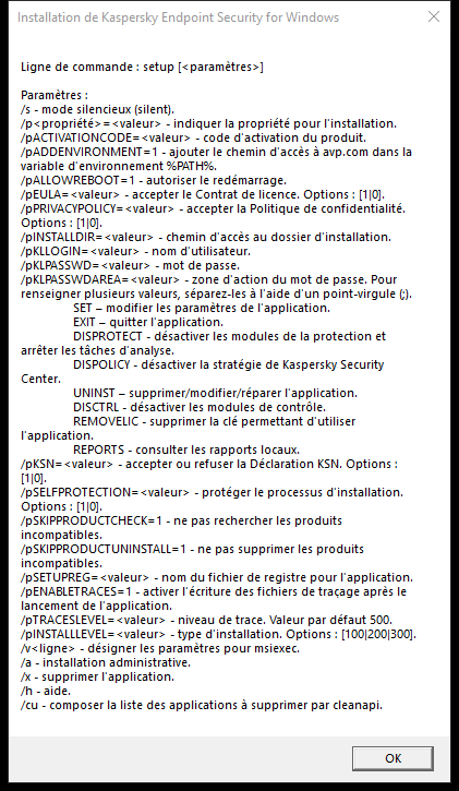 setup_kes.exe /pEULA=1 /pPRIVACYPOLICY=1 [/pKSN=1|0] [/pALLOWREBOOT=1] [/pSKIPPRODUCTCHECK=1] [/pSKIPPRODUCTUNINSTALL=1] [/pKLLOGIN=<nom d'utilisateur> /pKLPASSWD=<mot de passe> /pKLPASSWDAREA=<zone d'action du mot de passe>] [/pENABLETRACES=1|0 /pTRACESLEVEL=<niveau de traçage>] [/s]