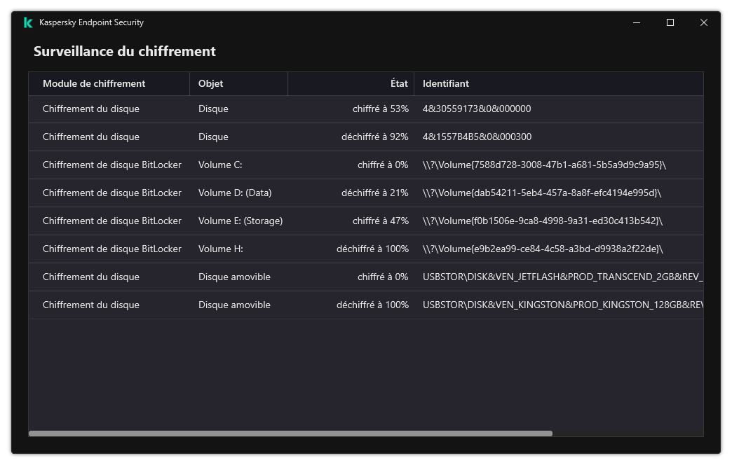 Vous pouvez utiliser l'outil Surveillance du chiffrement pour contrôler le processus de chiffrement ou de déchiffrement du disque sur l'ordinateur d'un utilisateur. Vous pouvez exécuter l'outil Surveillance du chiffrement à partir de la fenêtre principale de l'application.