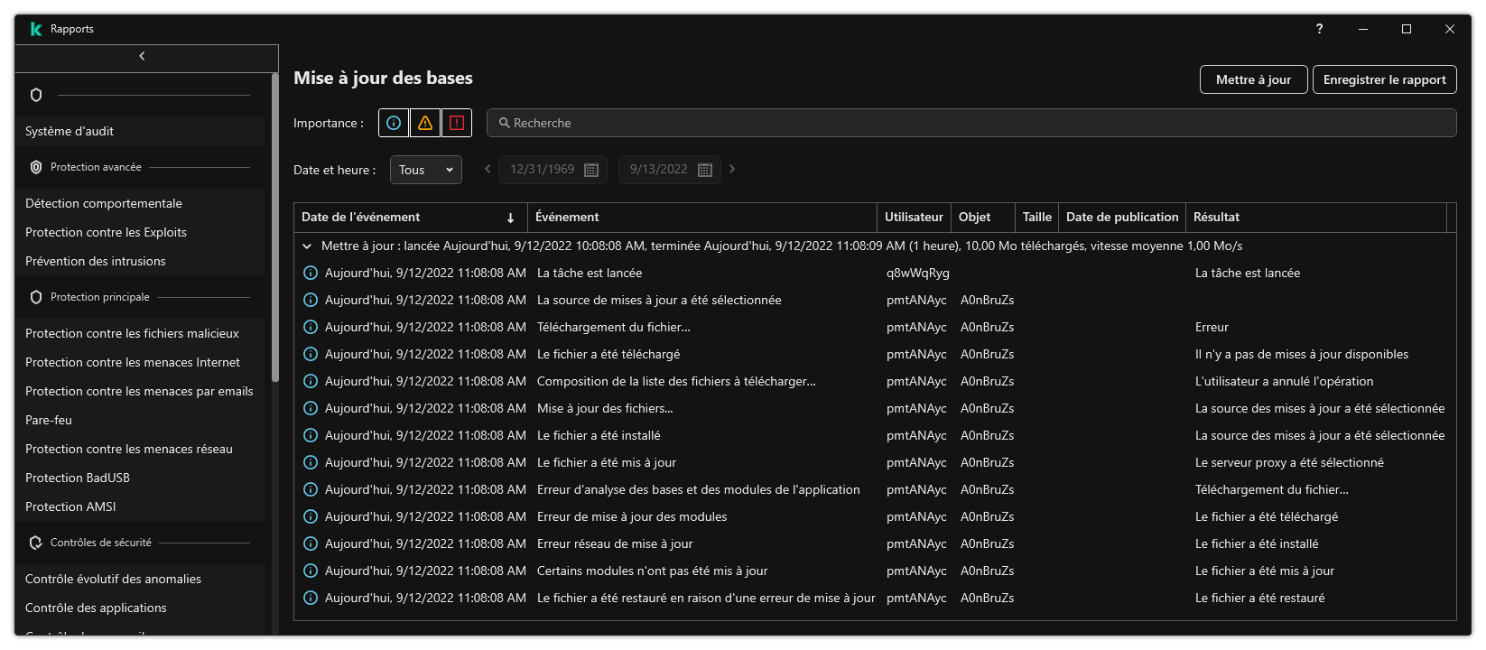 La partie droite de la fenêtre affichera le rapport qui contient la liste des événements sur le fonctionnement du module sélectionné ou de la tâche de Kaspersky Endpoint Security.
