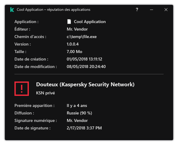 Si vous doutez de la sécurité d'un fichier, vous pouvez vérifier sa réputation dans Kaspersky Security Network.