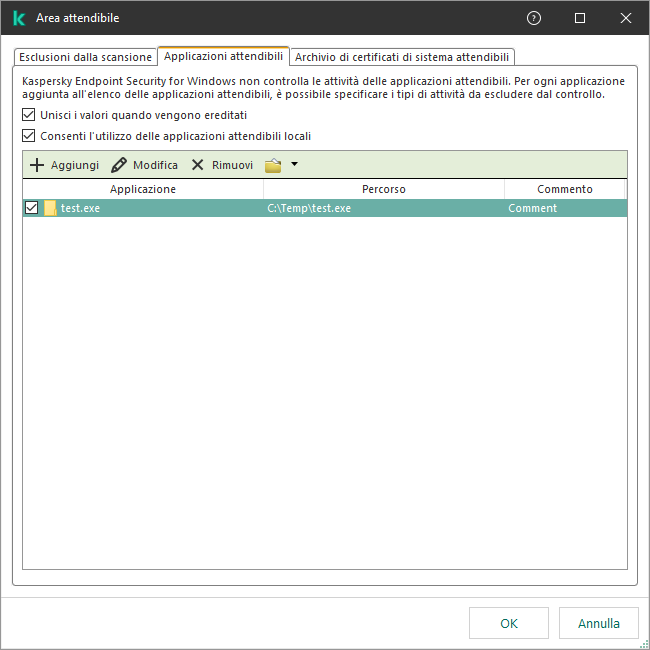Il file eseguibile e il processo dell'applicazione attendibile sono comunque sottoposti a scansione alla ricerca di virus e altro malware. Utilizzando le esclusioni dalla scansione, è possibile escludere completamente un'applicazione dalla scansione da parte di Kaspersky Endpoint Security.