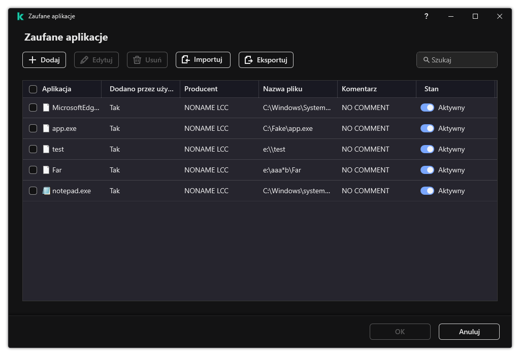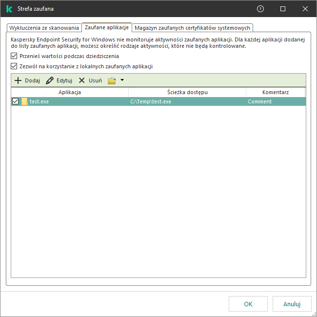 Lista zaufanych aplikacji jest listą aplikacji, których aktywność sieciowa i plikowa (włączając w to szkodliwą aktywność) oraz dostęp do rejestru systemowego nie są monitorowane przez Kaspersky Endpoint Security. Domyślnie program Kaspersky Endpoint Security skanuje obiekty otwierane, uruchamiane lub zapisywane przez proces dowolnej aplikacji i monitoruje aktywność wszystkich aplikacji oraz ruch sieciowy będący wynikiem ich działania. Jednakże aplikacja, która została dodana do listy zaufanych aplikacji zostanie wykluczona ze skanowań wykonywanych przez Kaspersky Endpoint Security.