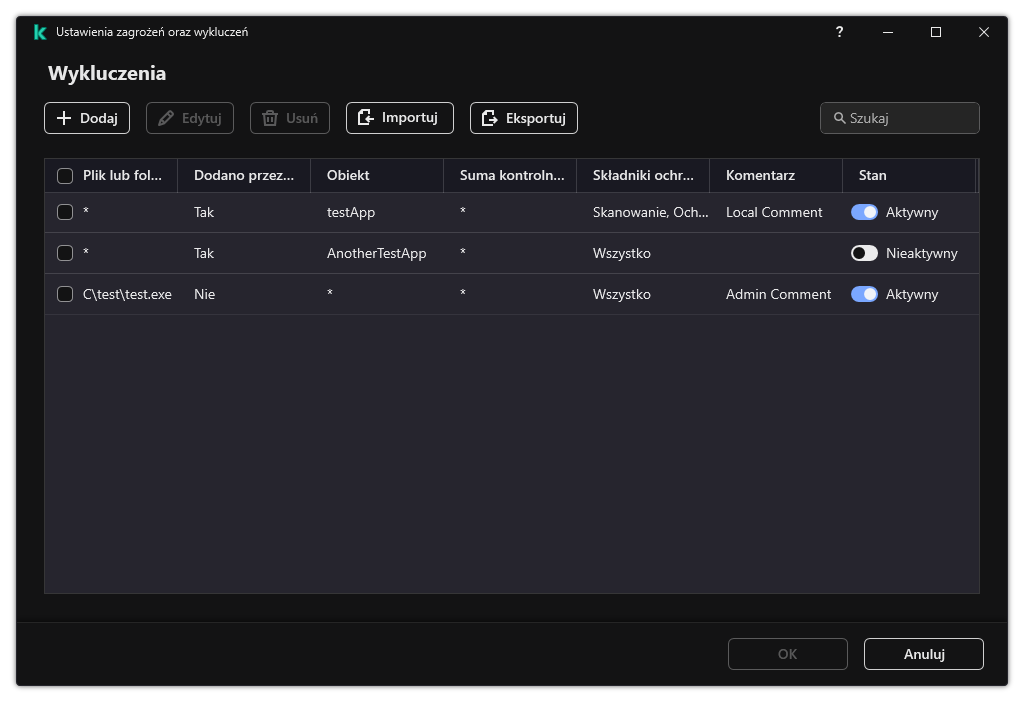 W przypadku, gdy komponenty nie zostaną określone w ustawieniach wykluczenia ze skanowania, to wykluczenie będzie stosowane podczas skanowania przez wszystkie moduły programu Kaspersky Endpoint Security.