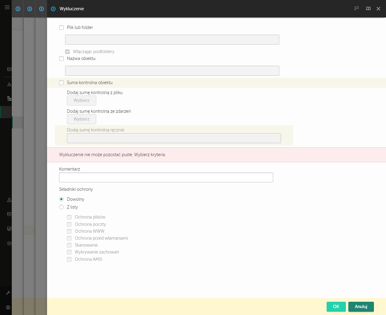 - Jeśli chcesz wykluczyć pojedynczy plik ze skanowania, wprowadź sumę kontrolną pliku w polu Suma kontrolna obiektu.