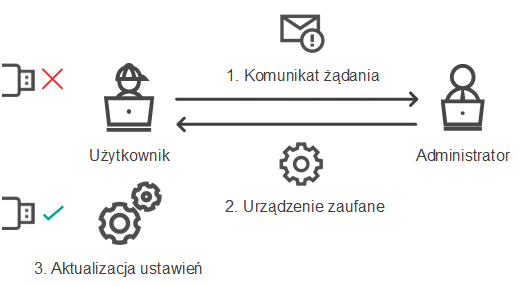 Jeśli Kaspersky Security Center nie jest zainstalowany w Twojej organizacji, możesz udzielić dostępu do urządzenia w ustawieniach Kaspersky Endpoint Security. Na przykład, możesz dodać urządzenie do listy zaufanych lub tymczasowo wyłączyć Kontrolę urządzeń.