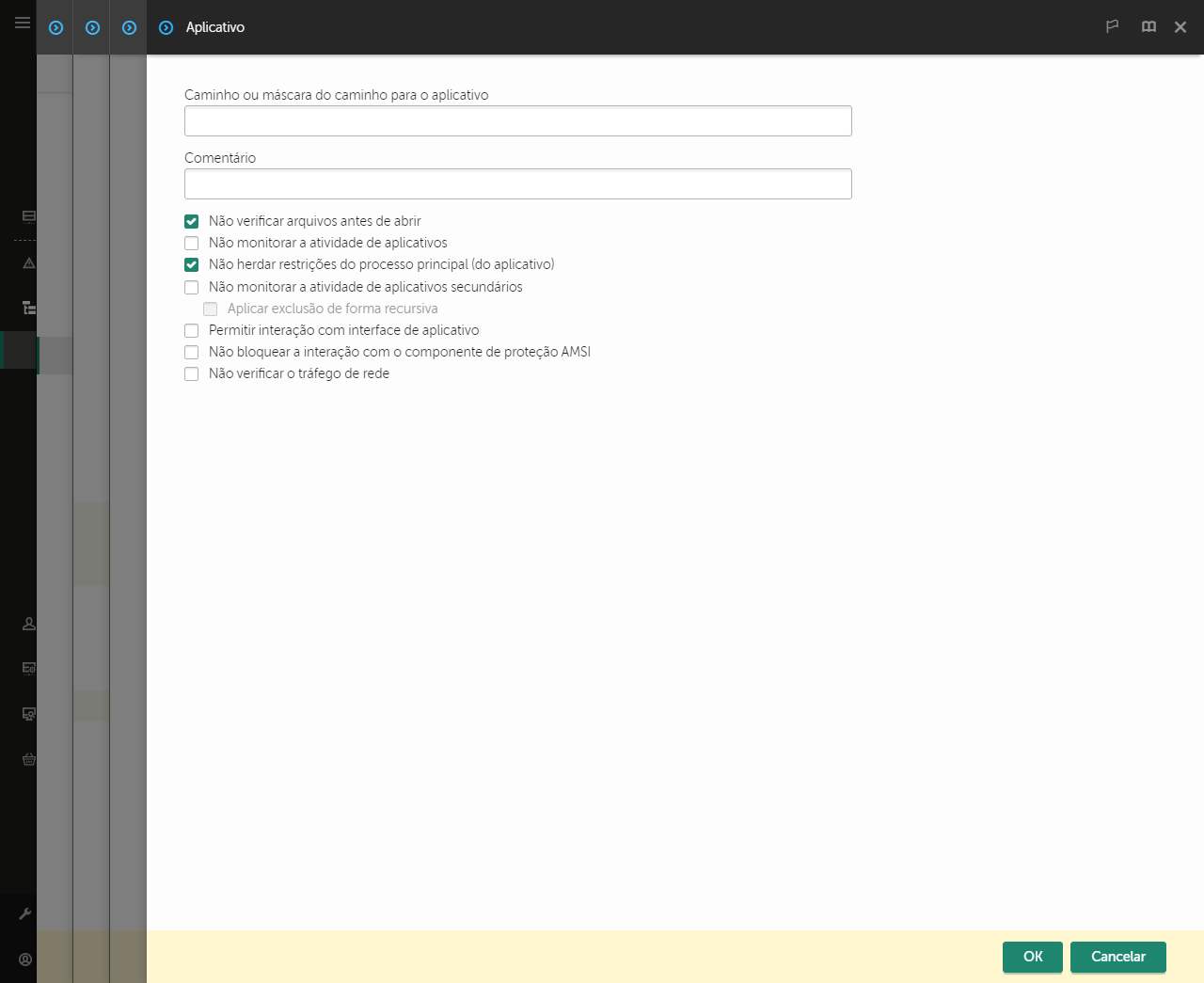 O Kaspersky Endpoint Security não monitorará os arquivos do aplicativo e a atividade de rede no sistema operacional. A atividade do aplicativo é monitorada pelos seguintes componentes: Detecção de Comportamento, Prevenção de Exploit, Prevenção de Intrusão do Host, Mecanismo de Remediação e Firewall.