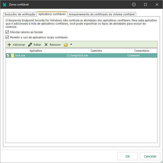A lista de aplicativos confiáveis é uma lista de aplicativos cuja atividade de arquivo e rede (inclusive atividade maliciosa) e acesso ao registro do sistema e que não são monitorados pelo Kaspersky Endpoint Security. Por padrão, o Kaspersky Endpoint Security verifica todos os objetos que são abertos, executados ou salvos por qualquer processo do aplicativo e controla a atividade de todos os aplicativos e tráfego de rede criada por eles. No entanto, um aplicativo que foi adicionado à lista de aplicativos confiáveis é excluído das verificações pelo Kaspersky Endpoint Security.