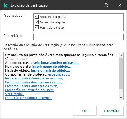 Uma exclusão de verificação é um conjunto de condições que devem ser atendidas para que o Kaspersky Endpoint Security não verifique um determinado objeto em busca de vírus e outras ameaças.