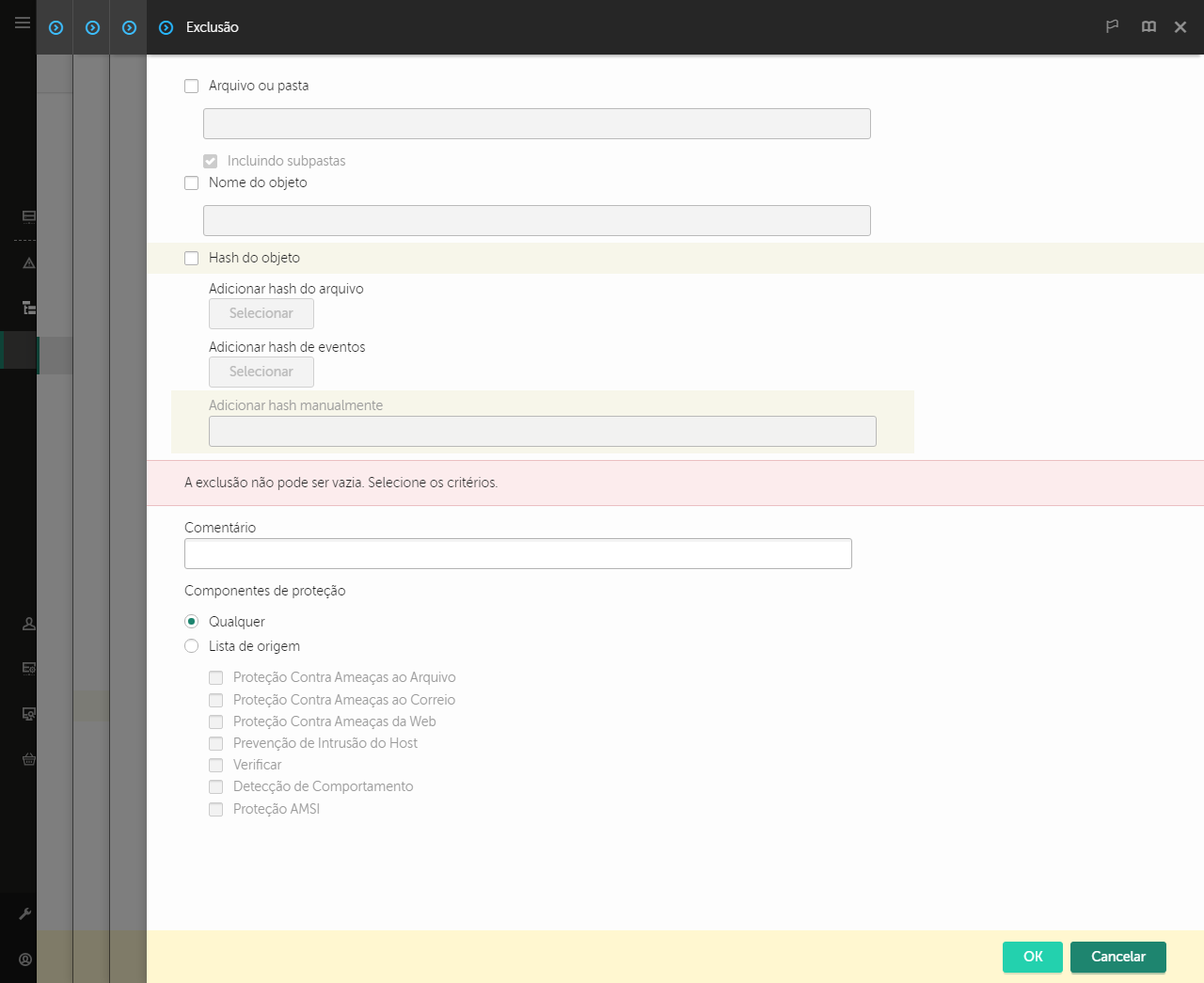 - Selecione como deseja adicionar a exclusão: Arquivo ou pasta, Nome do objeto ou Hash do objeto.