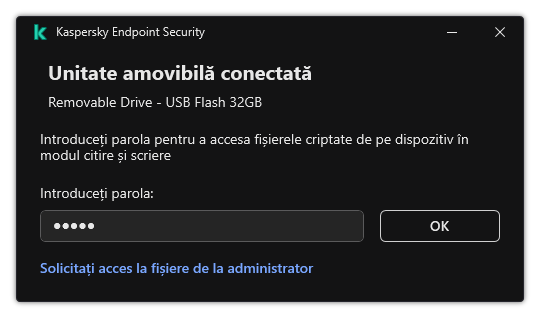 Puteți modifica permisiunile de acces la unitățile amovibile chiar și în timp ce unitatea amovibilă este conectată la computer. Dacă se modifică permisiunile de acces la unitatea amovibilă, Kaspersky Endpoint Security va bloca accesul la fișiere și vă va solicita din nou parola.