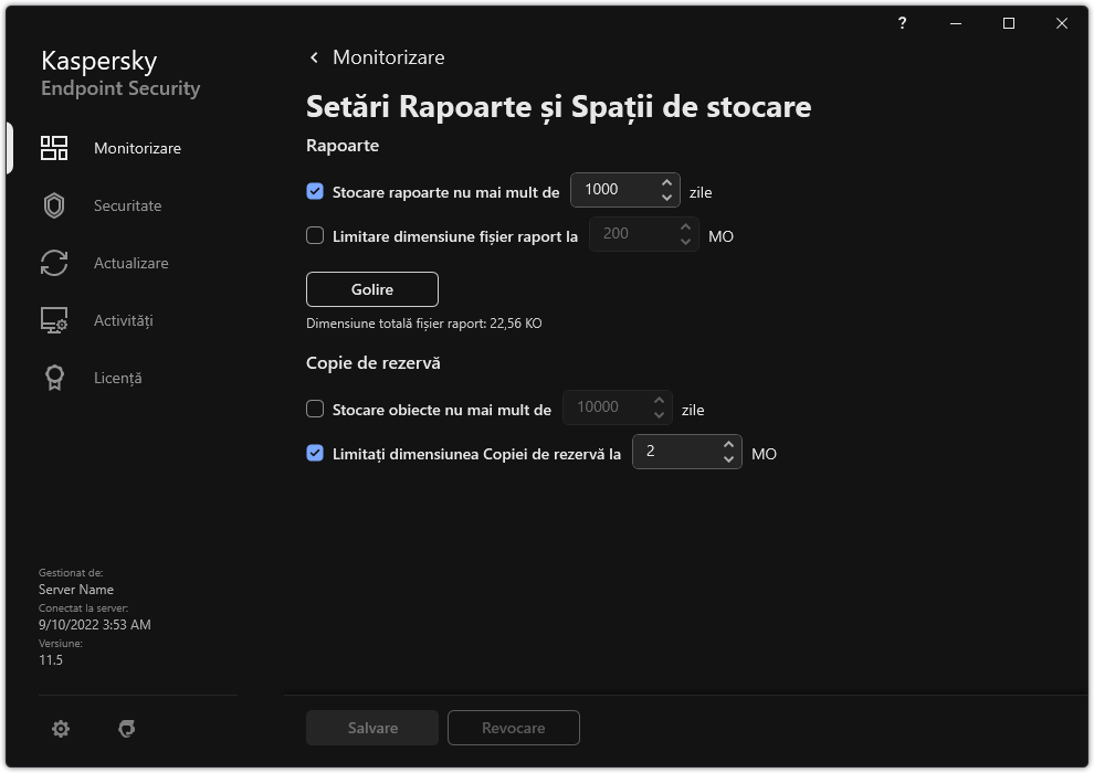 În fereastra cu setările aplicației, selectați Setări generale → Rapoarte și Spații de stocare.