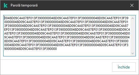 Se poate utiliza o parolă temporară pentru a acorda acces temporar la Kaspersky Endpoint Security pentru un computer individual din afara rețelei companiei. Acest lucru este necesar pentru a permite utilizatorului să efectueze o acțiune blocată fără a obține acreditările contului KLAdmin. Pentru a utiliza o parolă temporară, computerul trebuie să adăugat la Kaspersky Security Center.