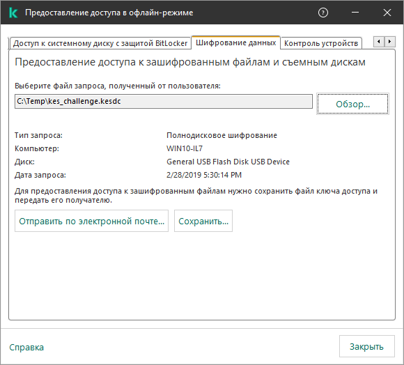 Отобразится информация о запросе пользователя. Kaspersky Security Center сформирует файл ключа доступа. Отправьте пользователю созданный файл ключа доступа к зашифрованным данным по электронной почте. Или сохраните файл доступа и передайте файл любым доступным способом.