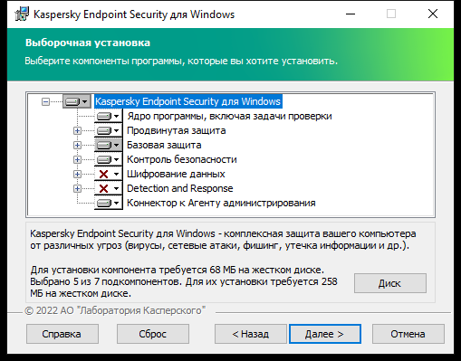 Kaspersky Endpoint Security проверяет выбор компонентов перед установкой приложения. Если конфигурация компонентов Detection and Response не поддерживается, установить Kaspersky Endpoint Security невозможно.