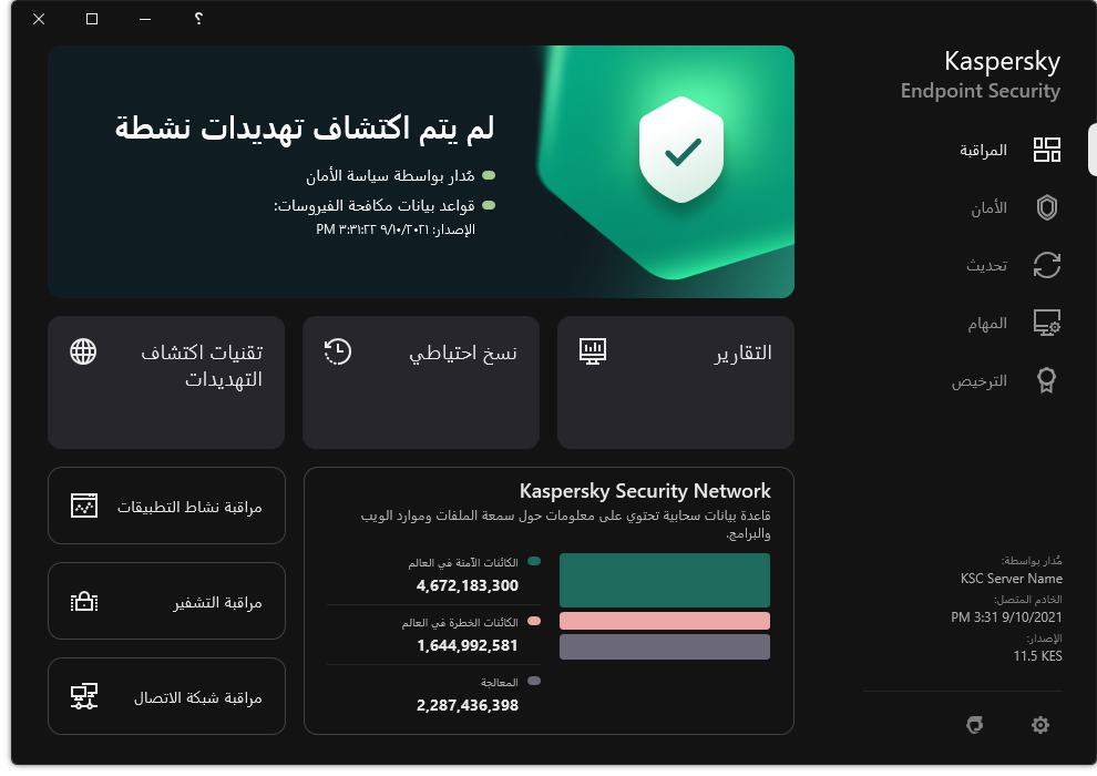 - Kaspersky Security Network. حالة الاتصال بين Kaspersky Endpoint Security وKaspersky Security Network وإحصائيات KSN العالمية. تعتبر شبكة Kaspersky Security Network (KSN) بنية تحتية من الخدمات السحابية التي توفر الوصول إلى قاعدة معارف Kaspersky على الإنترنت والتي تحتوي على معلومات عن سمعة الملفات وموارد الويب والبرامج. ويعد استخدام البيانات من Kaspersky Security Network ضمانًا لسرعة وقت استجابات Kaspersky Endpoint Security عند مواجهة تهديدات جديدة، كما يعمل ذلك على تحسين أداء بعض مكونات الحماية ويقلل من خطر وقوع الحالات الإيجابية الزائفة. إذا كنت تشارك في شبكة Kaspersky Security Network، فإن خدمات شبكة KSN تقوم بتزويد برنامج Kaspersky Endpoint Security بمعلومات حول فئة وسمعة الملفات التي تم فحصها، بالإضافة إلى معلومات حول سمعة عناوين الويب التي تم فحصها.