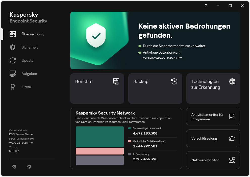 - Kaspersky Security Network. Status der Verbindung zwischen Kaspersky Endpoint Security und Kaspersky Security Network sowie globale KSN-Statistiken. Kaspersky Security Network (KSN) ist eine Infrastruktur von Cloud-Diensten, die Zugriff auf eine ständig aktualisierte Kaspersky-Wissensdatenbank bietet. Diese Datenbank enthält Informationen zur Reputation von Dateien, Internet-Ressourcen und Programmen. Durch die Nutzung von Daten aus Kaspersky Security Network wird die Reaktion von Kaspersky Endpoint Security auf unbekannte Bedrohungen beschleunigt und die Leistungsfähigkeit bestimmter Schutzkomponenten erhöht. Außerdem reduziert sich das Risiko von Fehlalarmen. Wenn Sie an Kaspersky Security Network teilnehmen, erhält das Programm Kaspersky Endpoint Security von den KSN-Diensten Informationen über die Kategorie und die Reputation untersuchter Dateien, sowie Informationen über die Reputation untersuchter Webadressen.