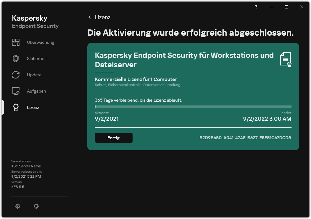 Zusatzinformationen über die Lizenz. Startdatum und Enddatum der Gültigkeitsdauer der Lizenz (nur für den aktiven Schlüssel), verbleibende Gültigkeitsdauer der Lizenz.