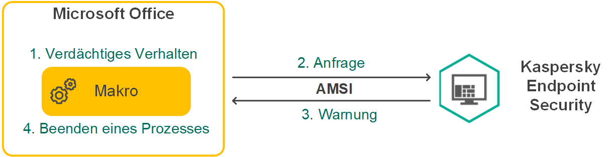 Die AMSI-Schutz-Komponente ist für die Unterstützung der Microsoft-Schnittstelle für „Antimalware Scan Interface“ vorgesehen. Mithilfe Schnittstelle für Antimalware Scan Interface (AMSI) können Dritthersteller-Anwendungen, die AMSI unterstützen, Objekte (z. B. PowerShell-Skripte) für eine zusätzliche Untersuchung an Kaspersky Endpoint Security senden und Untersuchungsergebnisse für diese Objekte erhalten. Dritthersteller-Anwendungen können z. B. Microsoft-Office-Programme sein (siehe folgende Abb.). Details über die AMSI-Schnittstelle finden Sie in der Microsoft-Dokumentation.