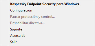 Salir. Este elemento cierra Kaspersky Endpoint Security. Al hacer clic en este menú contextual, la aplicación se descarga de la RAM del equipo.
