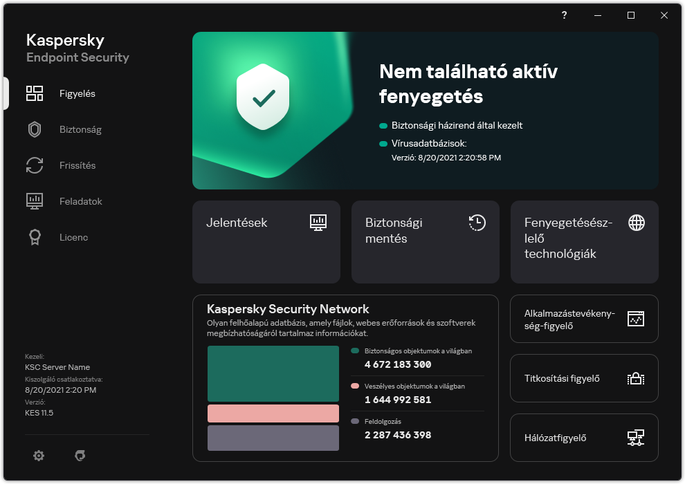 - Kaspersky Security Network. A Kaspersky Endpoint Security és a Kaspersky Security Network közötti kapcsolat és a globális KSN statisztika állapota. A Kaspersky Security Network (KSN) felhőalapú szolgáltatások egy olyan infrastruktúrája, amely hozzáférést nyújt a Kaspersky online tudásbázisához, ahonnan információkat kaphat fájlok, webes erőforrások és szoftverek megbízhatóságáról. A Kaspersky Security Network adatait felhasználva a Kaspersky Endpoint Security gyorsabban reagál az új típusú fenyegetésekre, egyes védelmi összetevők teljesítménye nő, a téves riasztások valószínűsége pedig csökken. Ha részt vesz a Kaspersky Security Networkben, a KSN szolgáltatás megadja a Kaspersky Endpoint Security számára a vizsgált fájlok kategóriáját és hírnevét, valamint a vizsgált webcímek hírnevét.