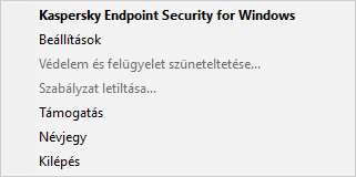Kilépés. Ezzel az elemmel kiléphet a Kaspersky Endpoint Security alkalmazásból. Erre a helyi menüelemre kattintva az alkalmazás törlődik a számítógép RAM-jából.