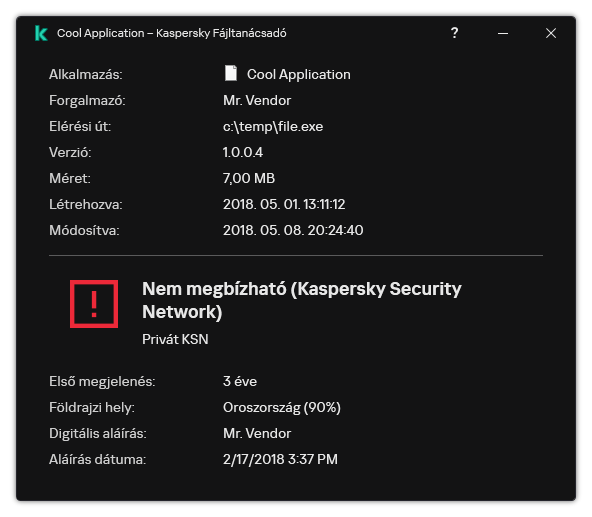 Nem megbízható (Kaspersky Security Network). Vírus vagy más alkalmazás, amely fenyegetést jelent.