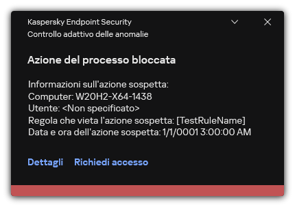 Messaggio relativo al blocco. Modello del messaggio visualizzato a un utente quando viene attivata una regola di Controllo adattivo delle anomalie che blocca un'azione non tipica. Messaggio all'amministratore. Modello del messaggio che un utente può inviare all'amministratore della rete aziendale locale se l'utente ritiene che il blocco sia un errore. Dopo che l'utente ha richiesto di fornire l'accesso, Kaspersky Endpoint Security invia un evento a Kaspersky Security Center: Messaggio all'amministratore per il blocco dell'attività di un'applicazione. La descrizione dell'evento contiene un messaggio all'amministratore con variabili sostituite. È possibile visualizzare questi eventi nella console di Kaspersky Security Center utilizzando la selezione di eventi predefinita Richieste utente. Se nell'organizzazione non è installato Kaspersky Security Center o non è presente alcuna connessione ad Administration Server, l'applicazione invierà un messaggio all'amministratore all'indirizzo e-mail specificato. |