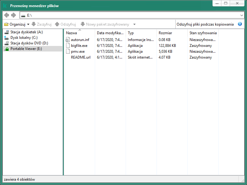 Kaspersky Endpoint Security szyfruje pliki na dysku wymiennym. Przenośny menedżer plików używany do pracy z zaszyfrowanymi plikami także zostanie dodany na nośniku wymiennym. Jeśli na dysku wymiennym znajdują się już zaszyfrowane pliki, Kaspersky Endpoint Security zaszyfruje je ponownie przy użyciu własnego klucza. Umożliwia to użytkownikowi dostęp do wszystkich plików na dysku wymiennym w trybie przenośnym.