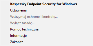 Zakończ. Element ten zamyka Kaspersky Endpoint Security. Kliknięcie tego elementu menu kontekstowego powoduje wyładowanie aplikacji z pamięci RAM komputera.