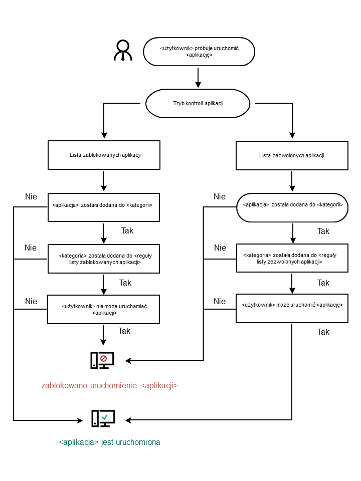 Kaspersky Endpoint Security wykorzystuje algorytm do podjęcia decyzji o uruchomieniu aplikacji (patrz rysunek poniżej).
