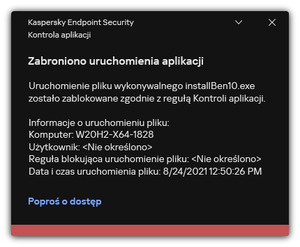 Jeśli użytkownik spróbuje uruchomić niedozwoloną aplikację, Kaspersky Endpoint Security zablokuje uruchomienie aplikacji i wyświetli powiadomienie (patrz rysunek poniżej).